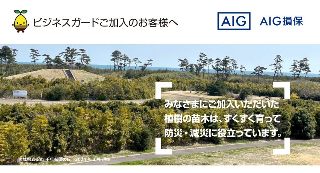 AIG 損害保険株式会社は「MORINO プロジェクト」を通じ、津波など自然災害、火災からいのちを守る森づくりに取組んでいます。皆さまの「ビジネスガード」のご加…